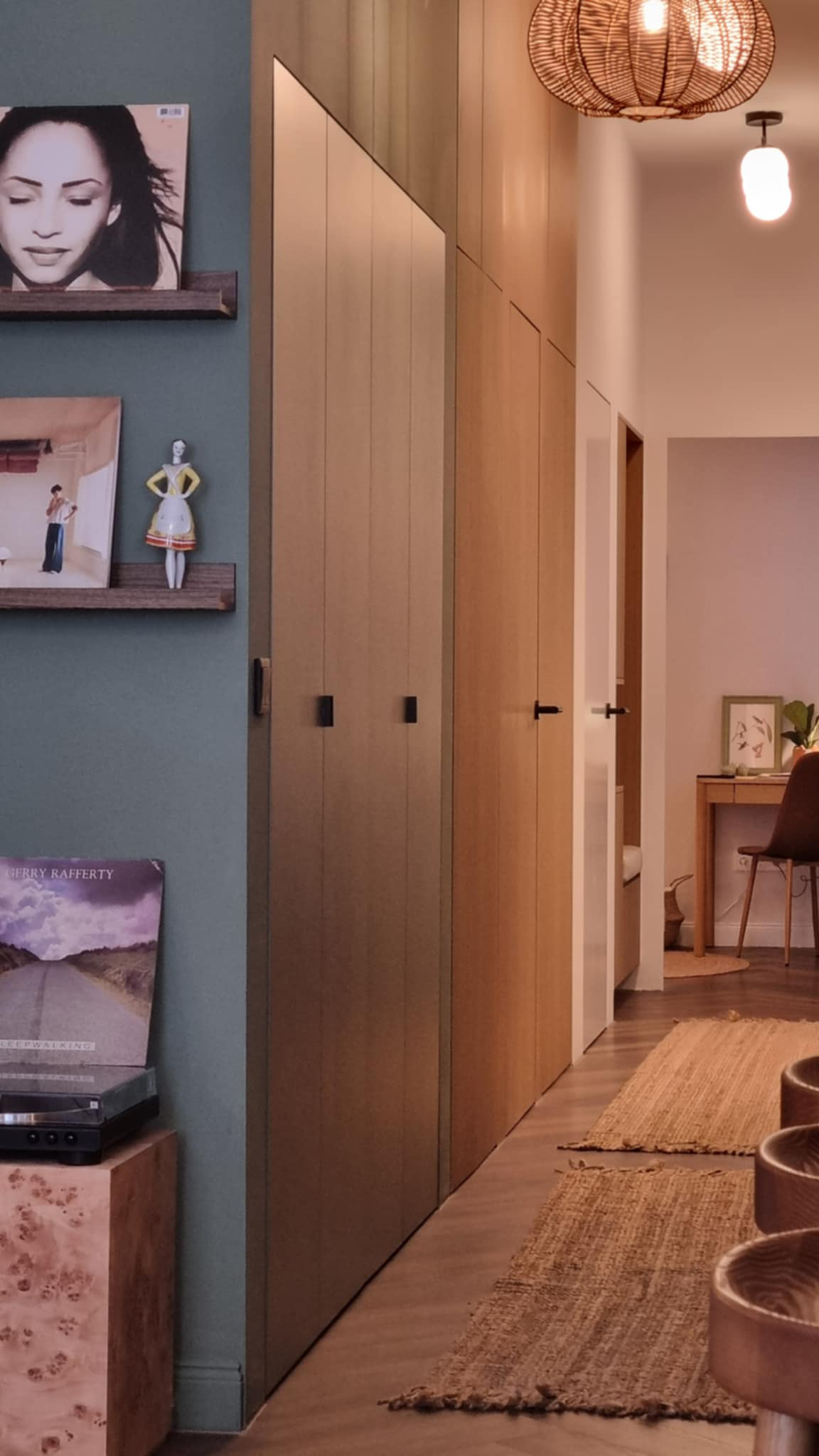 A legújabb munkám egyike -VELVET ROOTS- igazi átalakulás volt: új szobák születtek, saját gardróbszoba, amely közvetlenül a hálóból nyílik, és két fürdőszoba is helyet kapott – közülük az egyik teljesen privát, csak a fő hálószobához tartozik. A praktikus mosókonyha, a hangulatos kávézósarok és az egybenyitott nappali–konyha pedig tágas, mégis otthonos életteret teremtettek.