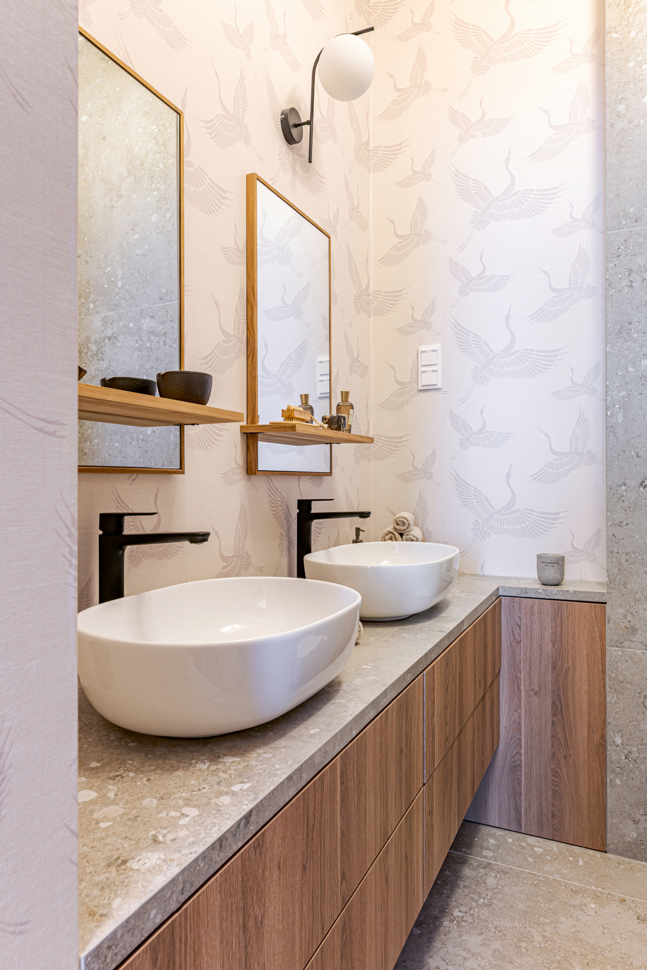 A legújabb munkám egyike -VELVET ROOTS- igazi átalakulás volt: új szobák születtek, saját gardróbszoba, amely közvetlenül a hálóból nyílik, és két fürdőszoba is helyet kapott – közülük az egyik teljesen privát, csak a fő hálószobához tartozik. A praktikus mosókonyha, a hangulatos kávézósarok és az egybenyitott nappali–konyha pedig tágas, mégis otthonos életteret teremtettek.