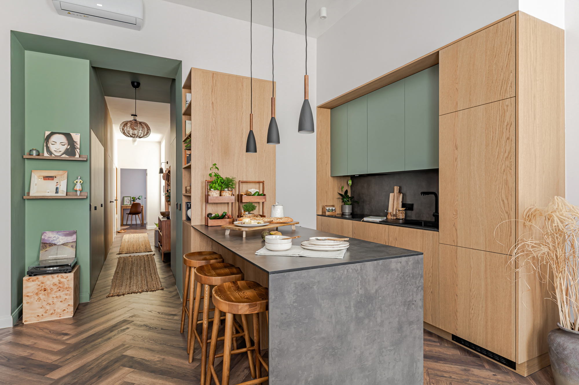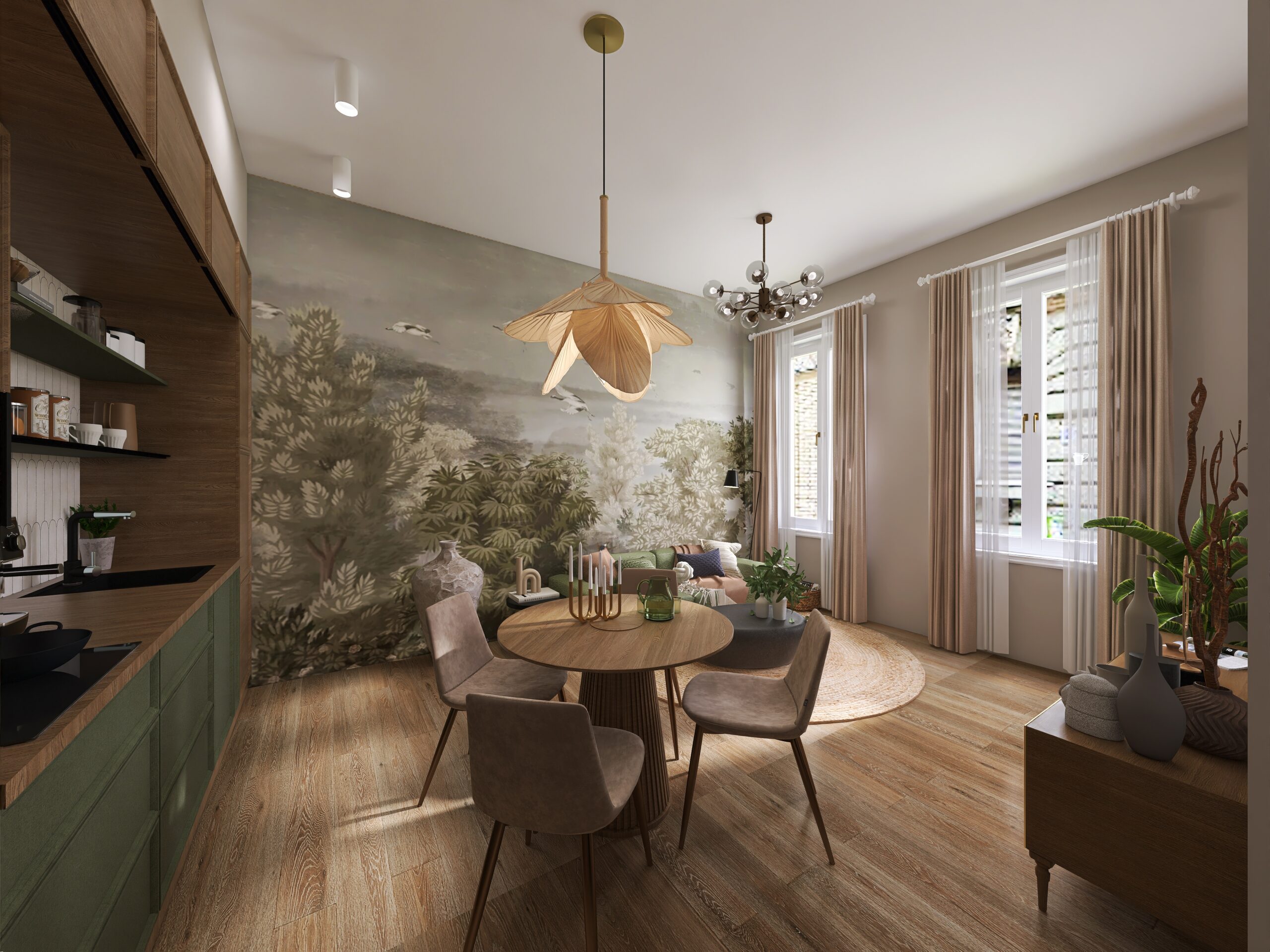 Egy városi liget hangulatát idéző otthon, ahol a zöld és földszínek nyugalmat hoznak a Palotanegyed lüktető közegébe. A tudatosan megtervezett térszervezés és az időtálló anyaghasználat kifinomult, mégis könnyen élhető enteriőrt hoz létre. Olyan koncepció, amely egyszerre szólítja meg az értéket kereső befektetőt és a városi nyugalomra vágyó lakót..
